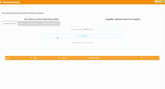 This link will take you to the Breadcrumb Supplier portal. From here, under the Supplier Documents tab, click on ‘Browse SWMS/RAMS Files’ and select the relevant file from your computer.