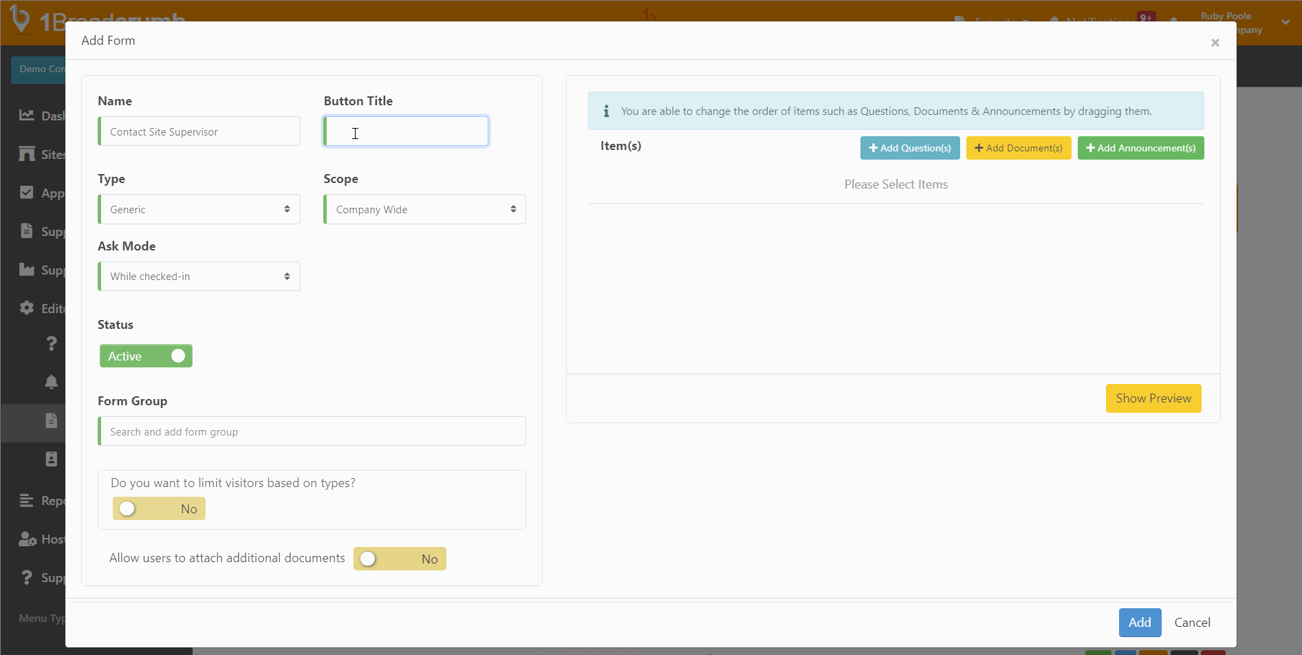 A guide to create a generic form of your choice for workers to fill out after they have checked in to a site.
