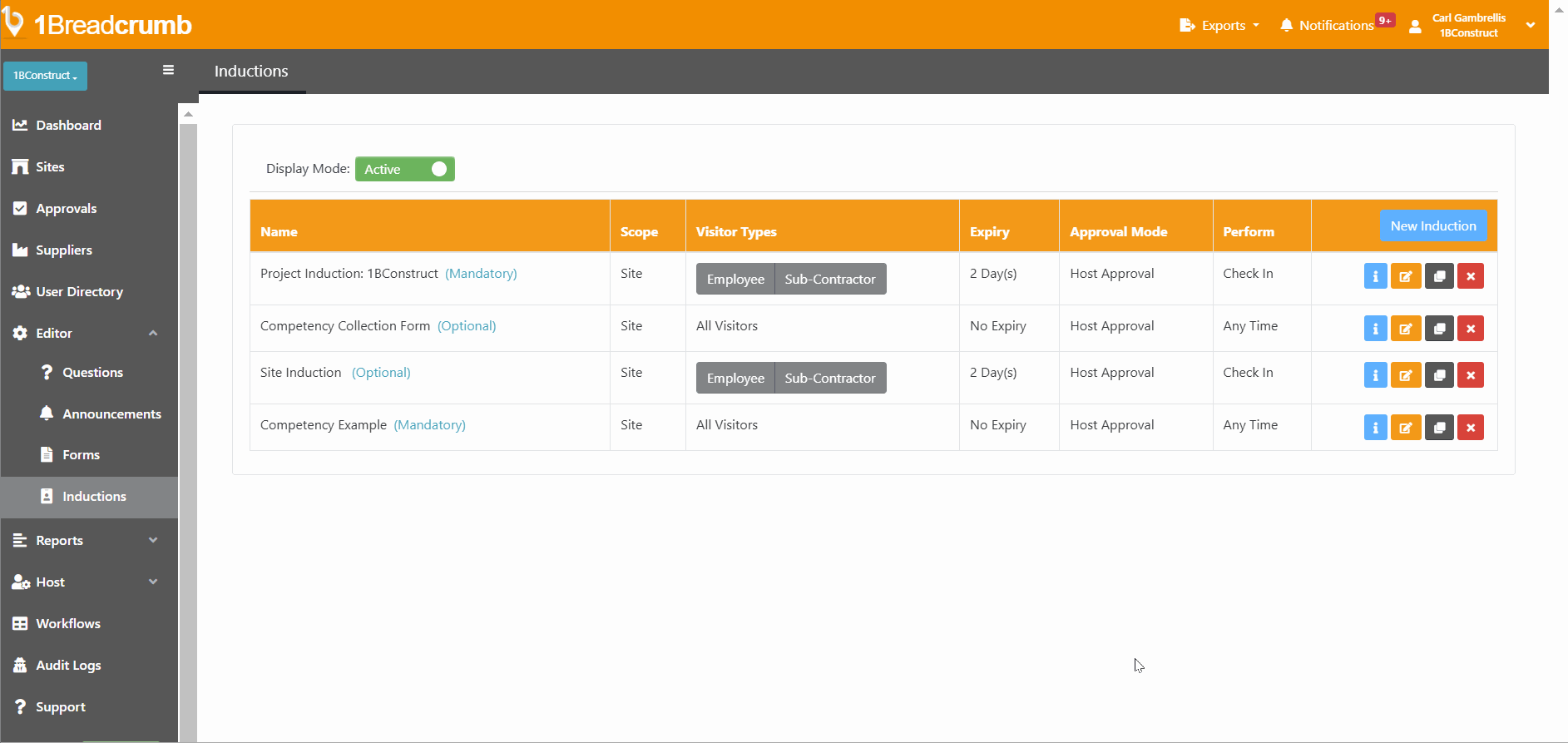 Navigate to the Editor tool located on the left-hand toolbar of your Breadcrumb portal and then select Inductions from the dropdown menu.