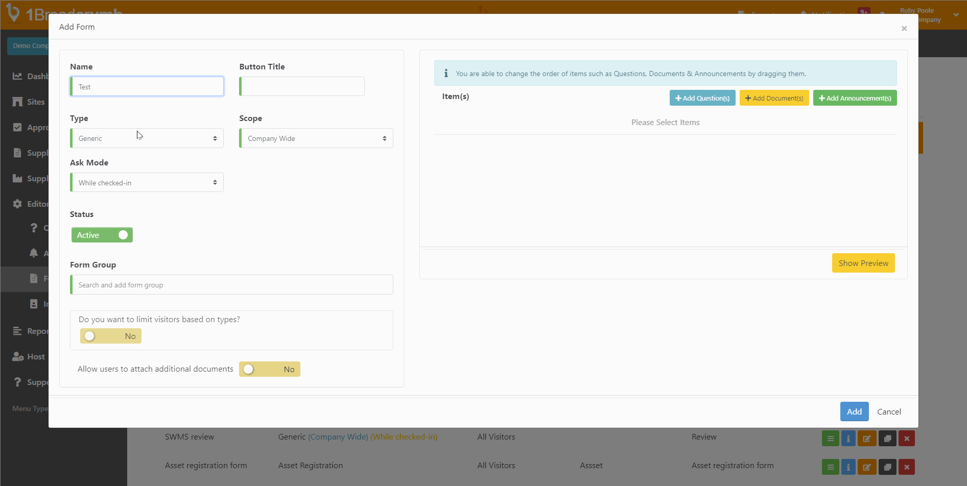 - Click Add in the bottom right hand side of the pop-up window to finalise your changes and create your Asset Operator Form