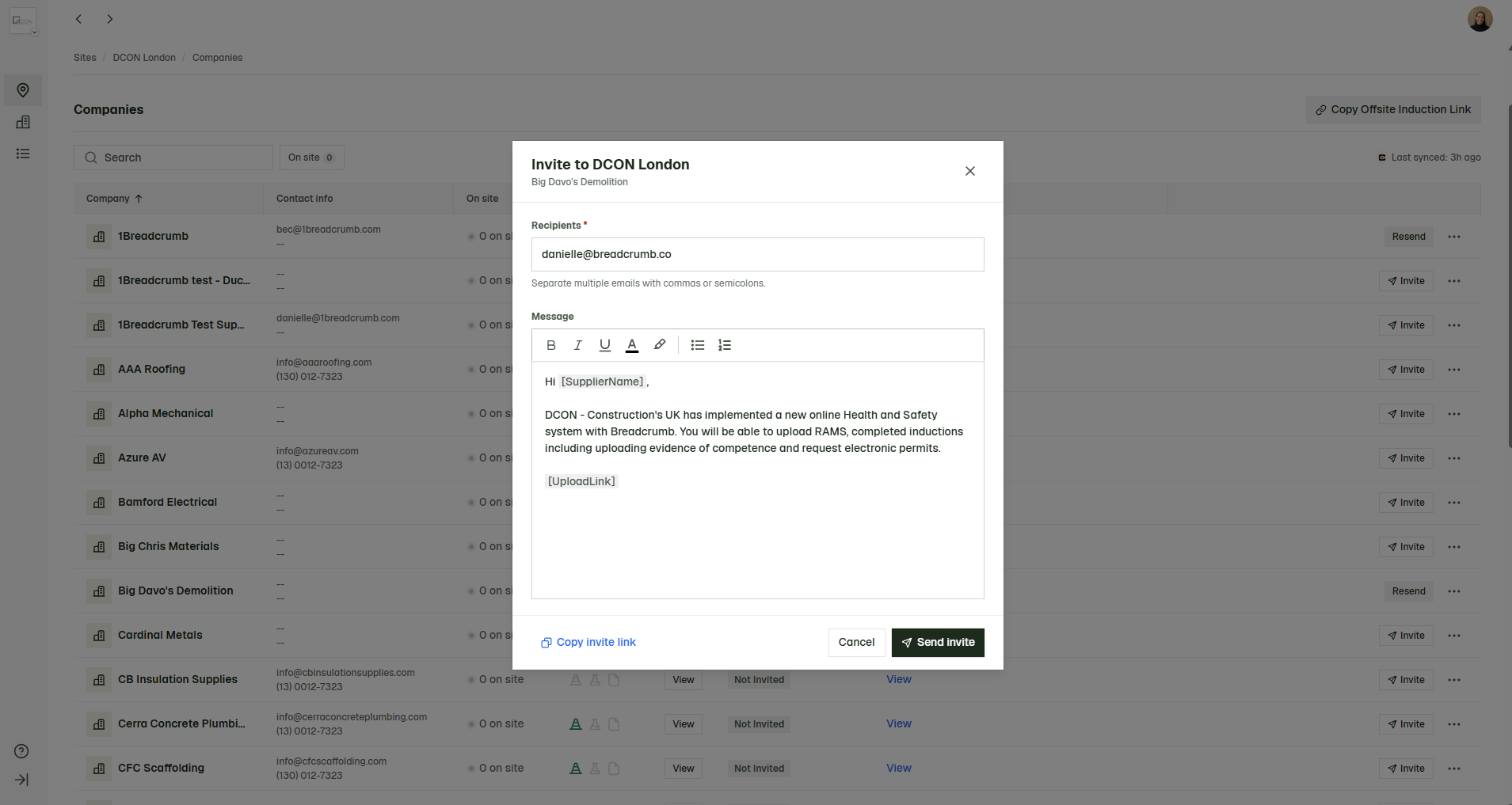 The subcontractor company name and site-specific details will automatically populate when the email is sent, so you do not need to update these manually.