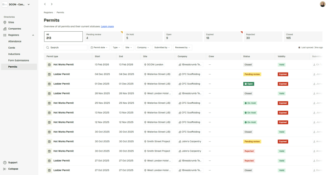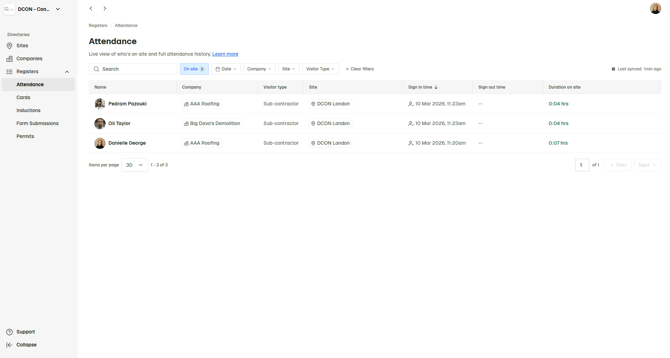 Attendance - Live view of who is currently on site (select the 'on site' filter), plus full attendance history