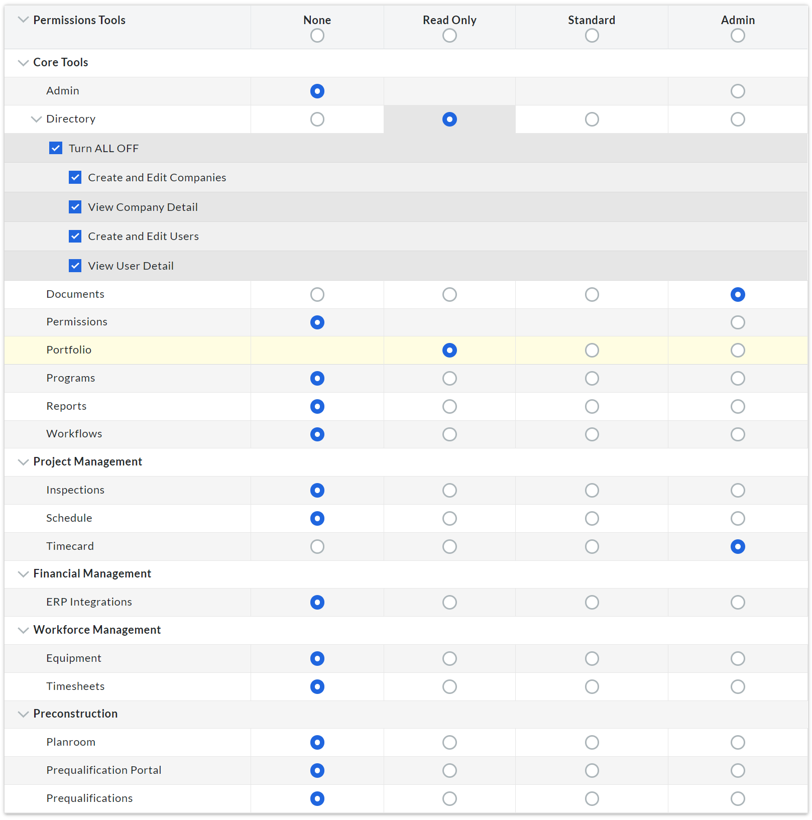 8. For all other Permission Tools/Core Tools settings, set them to None. - The below categories should have the Read Only column enabled:
